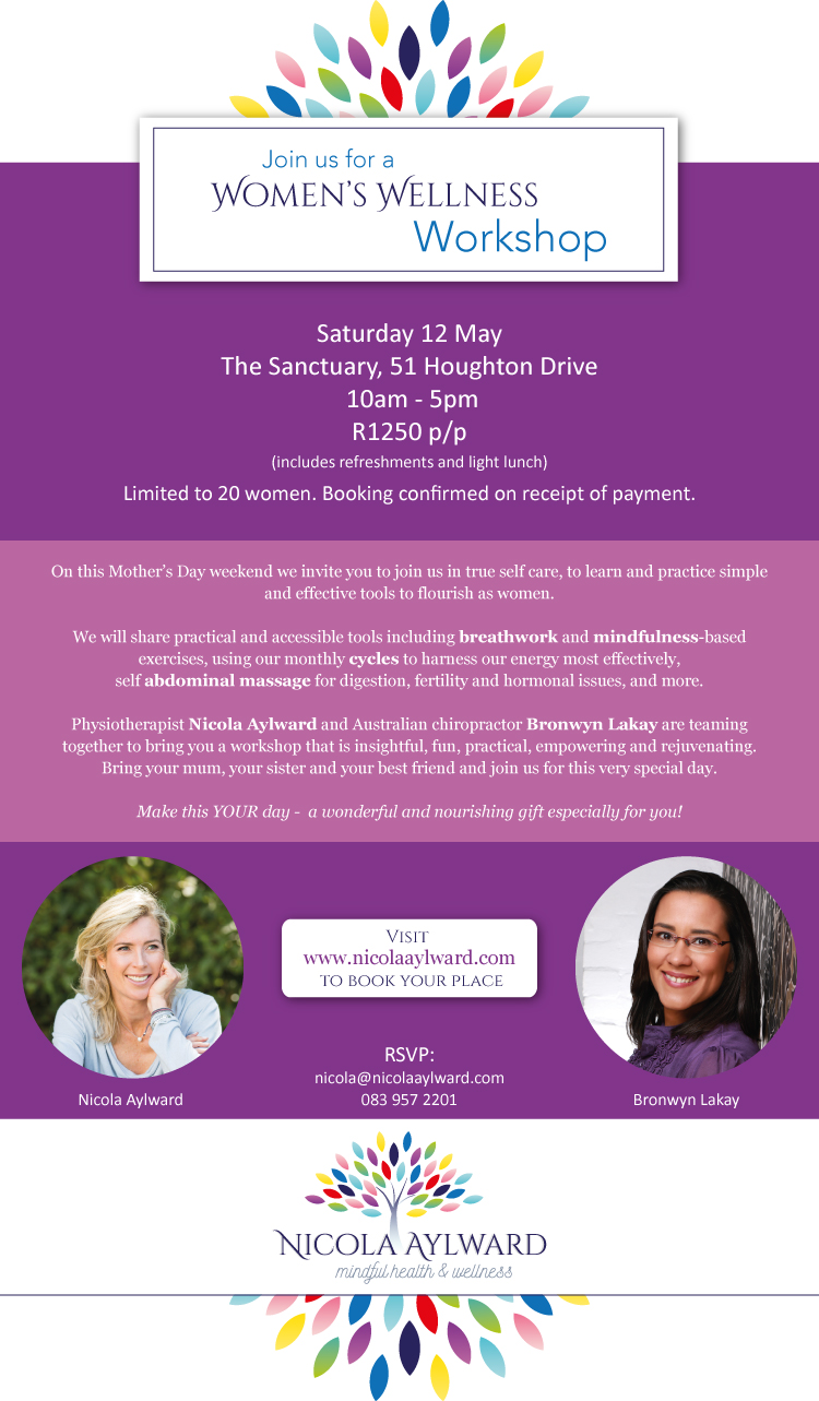 Bronwyn and I can’t wait to spend the day with you (or the women in your life) on Saturday 12th May at our Women’s Wellness Workshop. We’ll be sharing the latest research and the most effective tools to flourish. All in the magnificent grounds of The Sanctuary, the beautiful rooms and gardens of gynaecologist Dr Sumayya Ebrahim. Details are in our invitation below.
