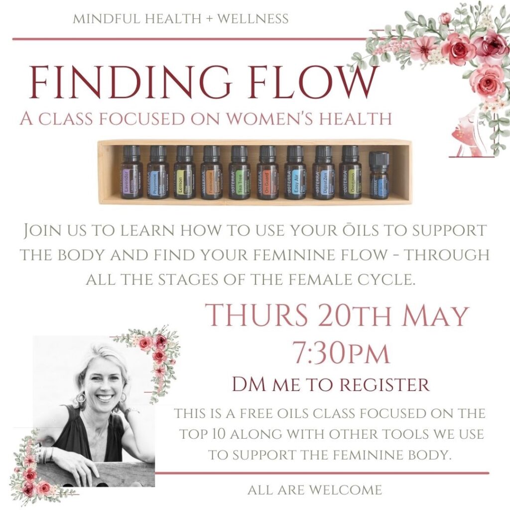 And on Thursday 20 May I will be teaching a free class called “Finding Flow” – an essential oils class focused on Women’s Health. I love my essential oils and use them daily to support myself and our family physically, mentally and emotionally. I cannot imagine life without them. This is a class for women who have oils to uplevel your use of them and to learn more about supporting women’s health issues with your oils. And it’s also for women who don’t use essential oils and who may be curious to know more about them, how to use them and how they work. The class is on zoom, details in the flyer below and click here to register, or go to my website www.nicolaaylward.com/essential-oil-classes/